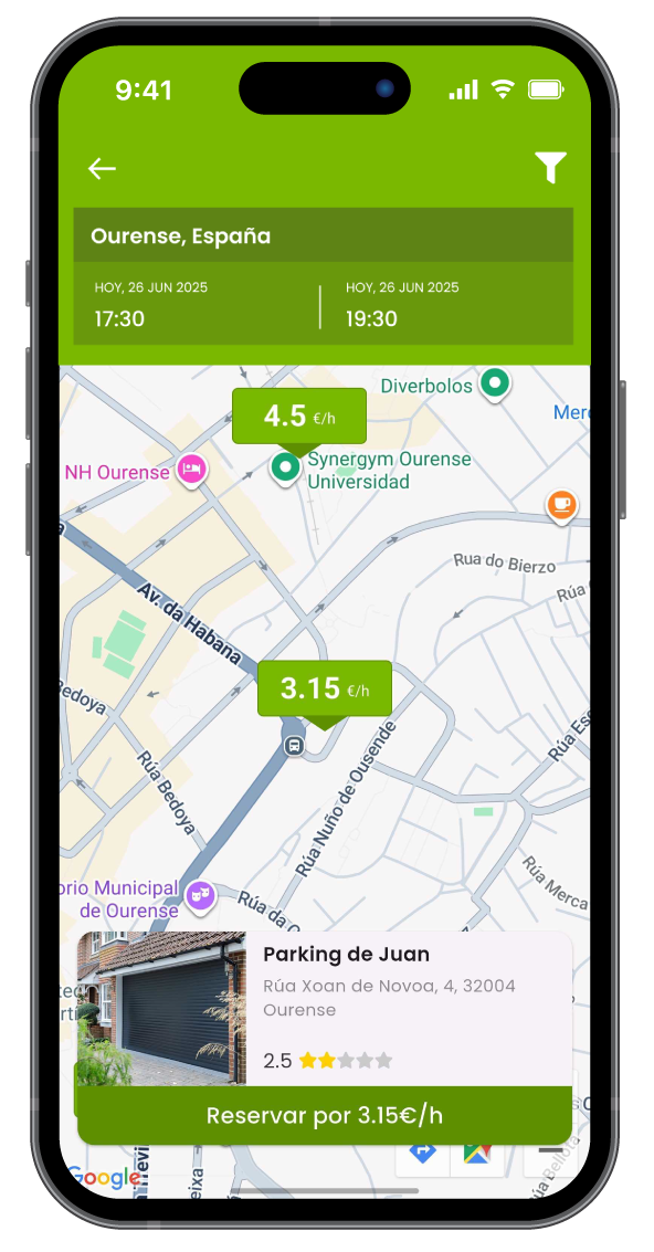 Si eres conductor puedes buscar plazas disponibles cerca de ti, filtrar por precio, horario o tipo de plaza, hacer la reserva desde el móvil y acceder directamente al aparcamiento, todo en pocos pasos.